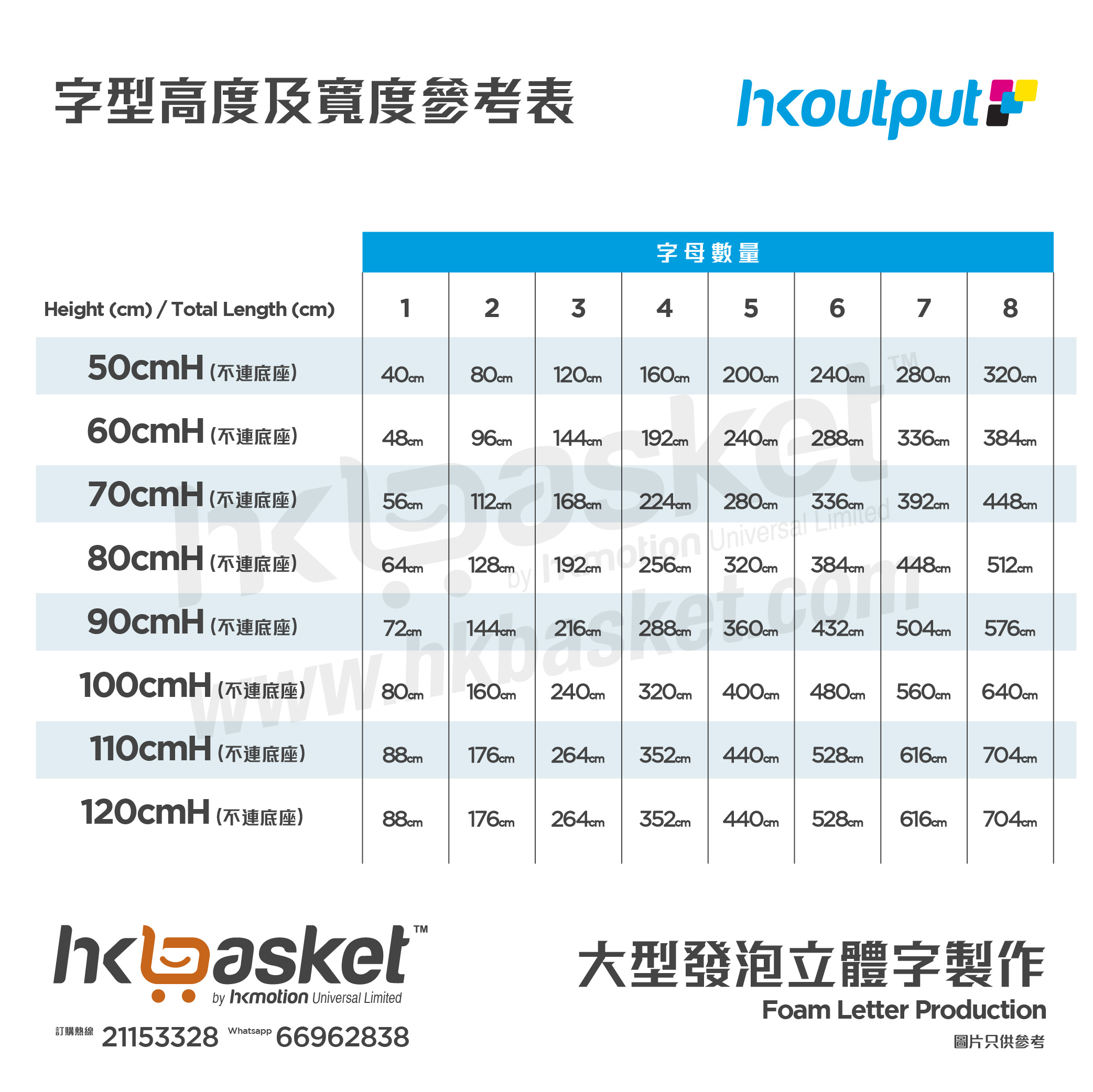 每隻文字一般高度及長度比例約為1比0.8, 部份字母或其他字型如超過此比例, 客戶需按個別情況補回差價