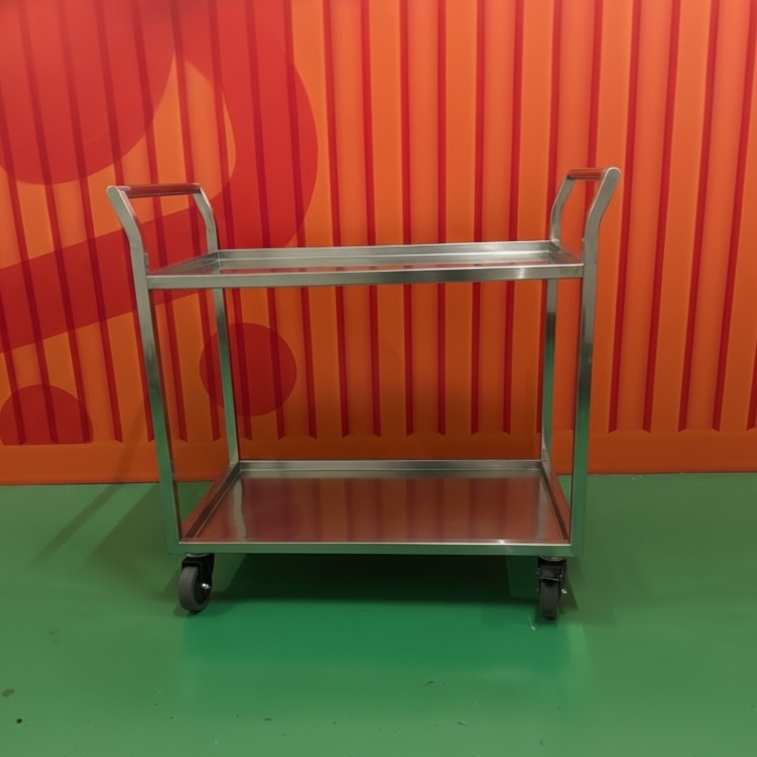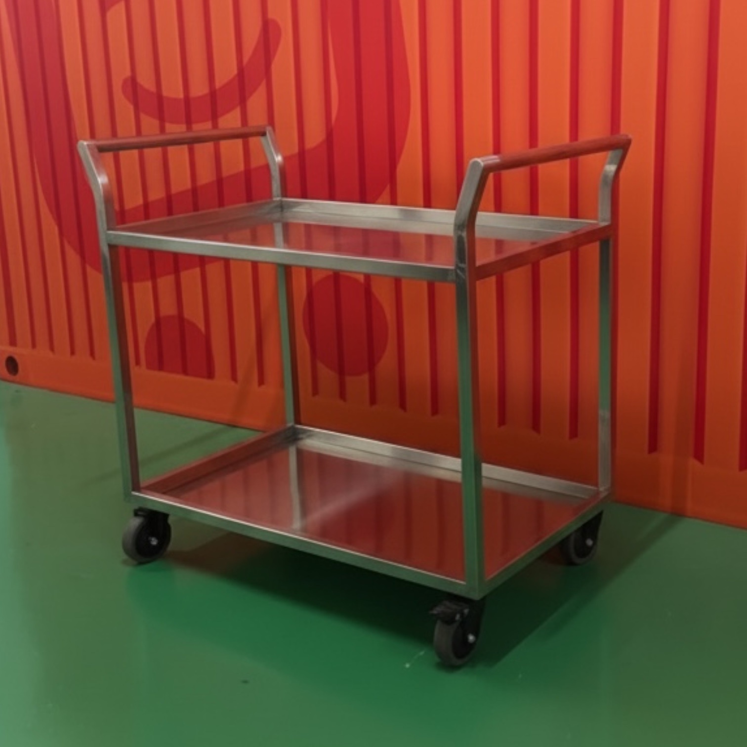不鏽鋼雙層手推車採雙彎手把設計,推拉省力、轉向更順,搭配靜音滑輪降低行走噪音,適合餐飲後場、倉儲、醫護與清潔搬運。車身尺寸 90×50×87 cm,雙層置物更好分配,總承重達 100 kg(每層 50 kg)。提供 201/304 不鏽鋼材質選擇,兼顧耐用與防鏽需求。